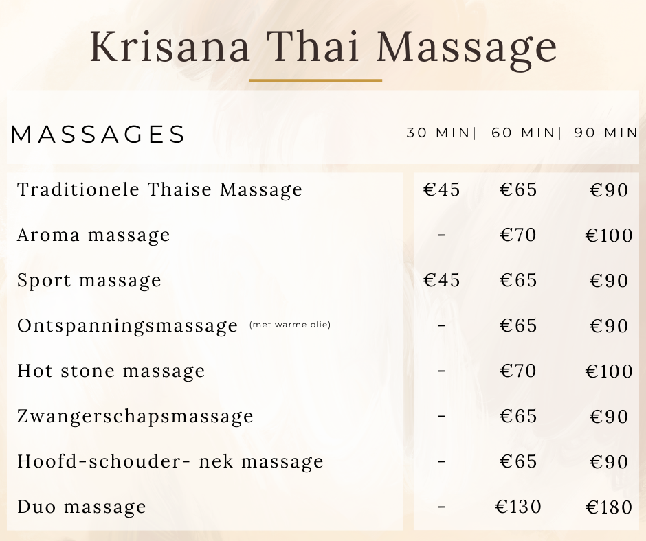 Heeft u last van vermoeidheid, stress of gespannen spieren? Een Thaise massage kan helpen deze klachten te verminderen. Ik bied verschillende massagetechnieken aan, waaronder: Traditionele Thaise massage, waarbij gebruik wordt gemaakt van een Thaise kruidenstempel voor extra verlichting. Ontspanningsmassage en hotstone massage, waarbij warme olie wordt gebruikt om diepe ontspanning en stressvermindering te bevorderen. Tijdens de massage wordt extra aandacht gegeven aan de spieren en klachtengebieden die u aangeeft, zodat u na afloop weer soepel en ontspannen voelt. Tot snel bij Krisana!